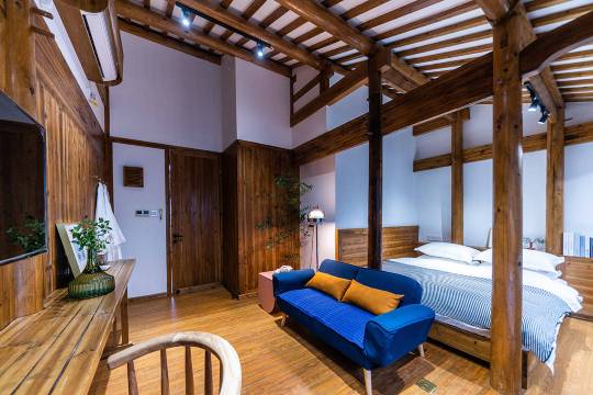 小重山民宿是我出游住过的最舒服的民宿,他离宏村两公里左右的卢村河边上。卢村是一个沿的河两边造的村落,河水清澈见底,河的左手边是卢百万家造的木雕楼群。度里(小重山)一楼进门宽敞通透,设计雅致,大堂后有一个天井休息闲聊处是开放式的,通风凉快惬意无需空调,左手边还有一长茶桌,住客可以在哪儿喝茶聊天,书法绘画。二楼一上楼梯就见女主弹的古琴,右手边还有喝茶下棋的空间,好是别样有趣。房间的屋顶全木头结构如旧翻新,令人感到温馨,每个房间都宽敞舒适,可以喝茶休息,打坐,卫生间的用具都有细节考虑。整个小楼设计如住家一般,来了就不想走,期待我带朋友们第二次来入住,五星级体验两星级消费。