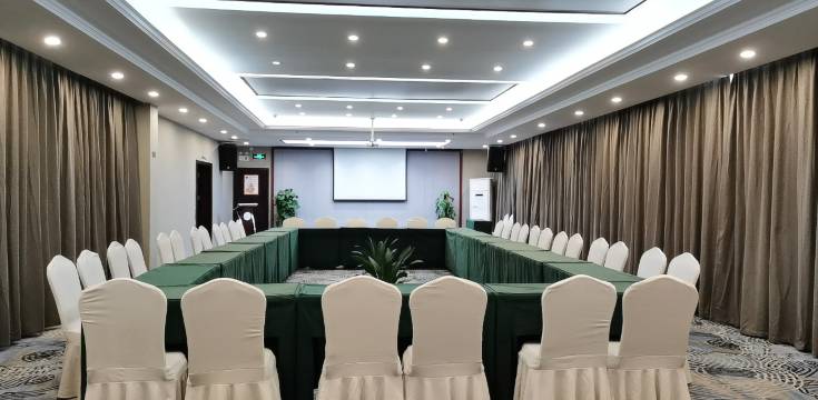 【会议室】位于酒店顶楼,新升级:所有的桌布和椅套更换成高级的灰白配,新的高清投影仪,同时还配备了先进的音响、话筒等其他多媒体设施,是您团建和培训的理想选择。