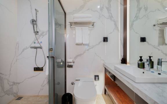 性价比超高的县城里的高级酒店——房间很宽敞,装修有特色,特别是茶台作为书桌子上也是非常值得。最满意的是感应恒温马桶🚽,不用动手就可以直接冲水…非常棒!