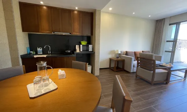 房间干净整洁,阳台泡泡茶,还可以泡温泉解乏👍,厨具用品等都备得挺齐的,甚至连垃圾袋、洗洁精、去污粉这些也都有,商家还是挺细心的👍,我们有自带食材、卡斯炉和户外锅具,吃得挺欢的😄😄,哈哈环境安静优美很不错,空气清新,酒店下去几分钟就有农家乐吃饭,做的味道还不错👍婆婆连吃了两碗米饭😀,挺完美的一次小旅行