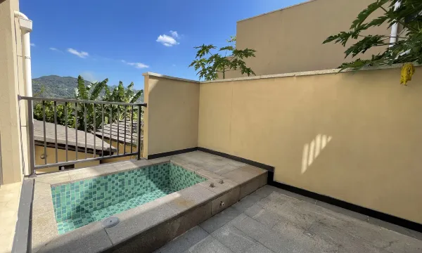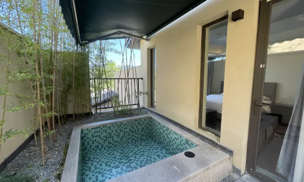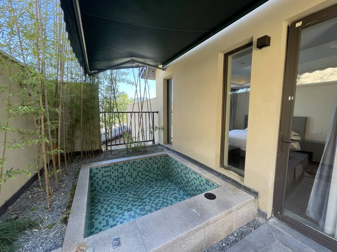 房间布置非常精致,床品柔软舒适,床垫就像家里的一样让人安心,一觉睡到天亮。卫生间干湿分离,空间宽敞,洗漱用品品质也很高。最让人惊喜的是房间自带温泉泡池,泡池上方有遮挡,四周还有电动卷帘,即使是下雨天或者刮大风也能安心享受温泉。