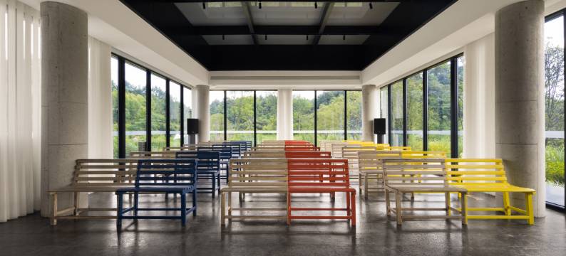 田居的原址是闲置的渭桥中学,固然老校舍已不堪使用而被拆除,但文脉、历史和曾经在此欢笑奋斗过的一代代徽州孩童的记忆不应消逝。保留校舍的基础和台阶石条,本地匠人用老手艺做成一道石墙,告诉后人曾经的故事;以解构主义的视角审视学校遗留的课桌、长椅、教具等等,就在田居以有趣的方式再次使用;实验室的各种器皿变作更加意想不到的用途……