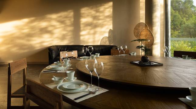 古老的徽州村落水系给了设计师引水成溪,打造“浣汲未妨溪路连,家家门前有清泉”的灵感,以多进院落、框景、静水面等手法,构建大到与周边村落、山水、田园融为一体,小到处处耐人品味的空间。在景观设计中,设计师抱持着“对徽州山水的尊重,对自然最小的干预”作为设计着力点,绝不过度使用外来之物,以秩序感构建徽州的常见植物在现代生活中的新鲜美感。而景观中大面积的油菜、水稻等传统农作物,令每个来访者可以在四时三餐中以不同的方式感受依山傍水的静谧和农作带来的安然之感。