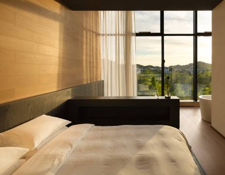 公社基于徽派建筑基调,撷取“粉墙黛瓦”的经典黑白色调和错落有致的立面层次,以极简的写意线条、契合大面的白墙和落地观景窗,营造“简练,朴素”的极简徽派建筑印象;客房的阔绰空间感、现代化的冷暖系统、门窗系统、净水系统给予客人不引人注目但又细致的呵护。