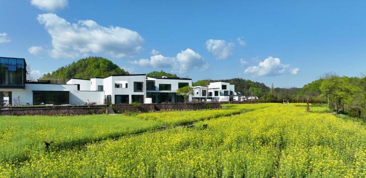 度假村位于安徽省黄山市休宁县渭桥乡霞溪,是一处被村落、花田、稻田、荷塘、山林、河流与湿地环抱的宁静之所。自有25亩景观田野,春可赏金色油菜花、夏秋可闻稻香。从客房步行两分钟穿过生机盎然的稻田,即可抵达紫溪河畔的私有码头,为皮划艇、桨板玩家提供宁静的专属水面。