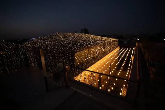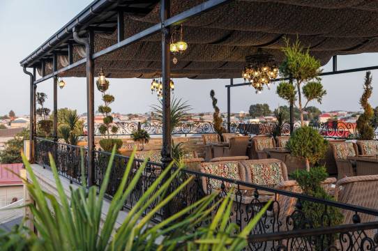 这家酒店可以一边用餐一边欣赏古尔阿米尔蓝色屋顶的美景。
