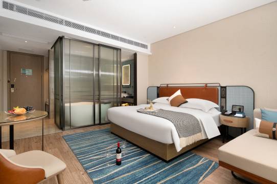 酒店房间格调商务时尚,全部客房配备小度智能语音控制系统,装修风格以轻奢北欧风,豪华、舒适为主,高速WIFI全覆盖;配套超300个停车位和300平方的多功能会议厅,周边有时尚购物商场,合成美食步行街,娱乐KTV、休闲沐足,吃喝玩乐俱全。期待您的光临!