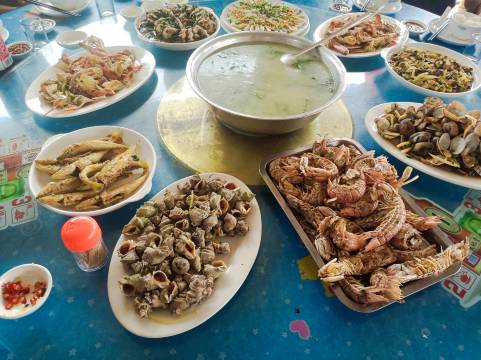 这家民宿是本地人自己开的,房间干净卫生,就在名宿就可以吃饭,一天三顿都可以在这里解决,份量很大,我们第一天,点了四个菜,七个人也够吃了,味道也还不错!早上的海鲜面可以试一下喔,我们几个小朋友都很喜欢吃!这里是一个渔村,民宿后面就可以赶海。虽然没有大城市那么繁华,但是海边的风景我们很喜欢,坐在礁石旁边吹吹海风,不要太惬意!拍照也很好看,没有人头喔!不用P图的喔!早上带几个小孩去赶了海,还遇见很多渔民!下面这些照片都是在民宿后面拍哒!