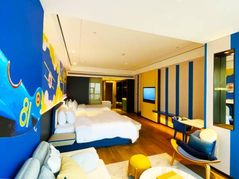 房间:1411云逸亲子房。特地告知前台留了飞机背景装饰的房间。