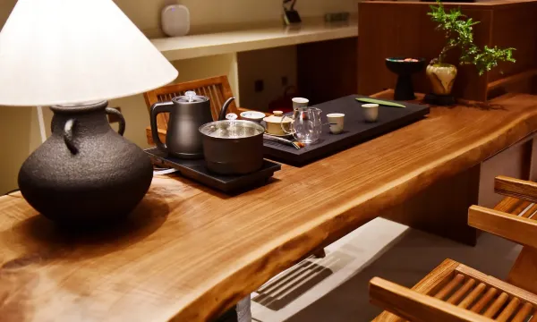 大厅整体以侘寂风格设计,以大量的木元素来烘托自然的气氛。大厅中间的三圆木桌,独特的木纹和微棕的色泽散发这自然的味道。大厅左侧的微波小池和黑胡桃茶台也在相互呼应,沏上一壶茶,看着飘荡在池底的条条波纹和水面摇曳的水仙,当也有种品茶观花的感觉。右侧是更多侘寂元素的堆叠。大圆黄麻地毯上自由摆放木饰家具,配以柔和的灯光,与朋友在此品茶、喝咖啡,惬意自由的时间也该如此了。