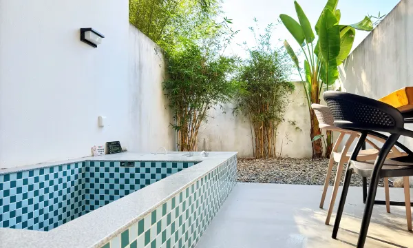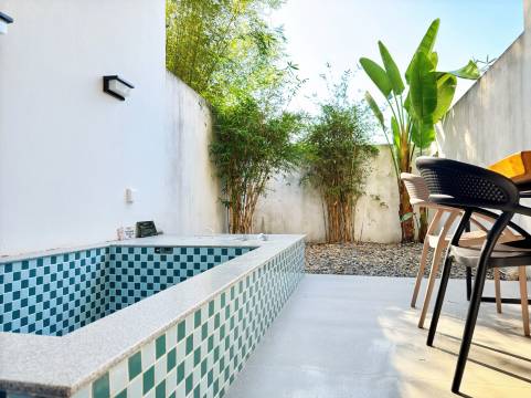 房间宽敞明亮,房间后面带小院,小院里有泡池和竹子,可休闲小憩。管家热情接待,快捷安排入住。民宿里有游泳池,夏天可避暑畅游。