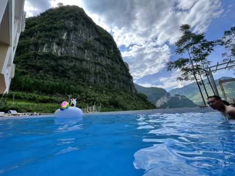 有公共泡池(山泉水)竹隐两个房间中间有个共享大露台,店主可以免费开车接送恩施大峡谷,除了水压稍弱以及附近没啥好逛之外,智能马桶自动冲洗,卫生布草都还不错……户外有个无边泳池,夏天一定很出片,正对着峡谷群山!住店的两天一直看到店主在给泳池和泡池加水换水,卫生还是有保障哒!