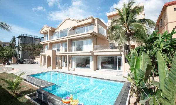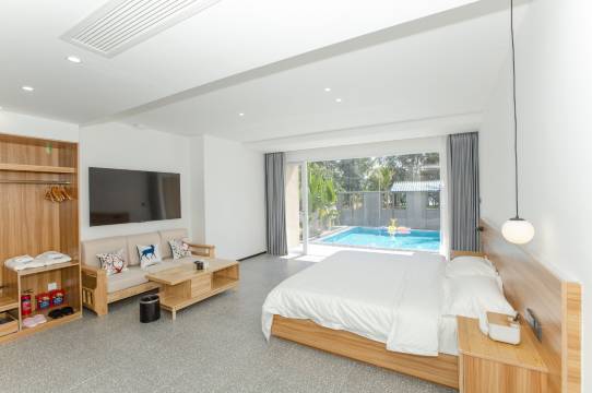 酒店每个房间一张2米×2米超大床,独立卫浴,独立洗衣机,智能投影。楼下600平私家庭院,配有餐厅,厨房,泳池,草坪,停车场,最多可停10辆车。周边配有篮球场,小吃街,沙滩酒吧。