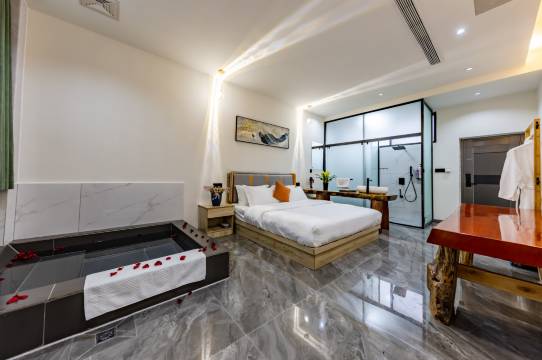 非常好的体验!临时预定入住这样一家民宿,体验感意外小惊喜!房间干净宽敞,床很大舒适,温泉(很多个池),温水游泳池(相当大),浴缸,应有尽有,小孩玩的开心,服务比较亲切。不在山上但是在小山脚下,周边植被丰富空气舒适,一夜好眠。性价比很高,好评!