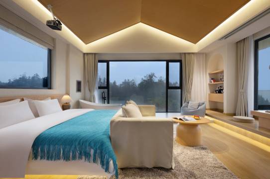 非常喜欢这家民宿,为了出行休息好我们一家三口特地定的亲子套房,一张2米、一张1.5米宽的床,两间房,还有两个阳台,住着非常舒适。房间干净卫生,设施也特别好,有投影,洁具也是大品牌,各种用品准备齐全。老板和工作人员服务都很热情,响应及时,有自己的餐厅,炒菜味道不错,早饭虽比不上酒店种类丰富,但胜在用心,稀饭、油条、面条、豆浆、牛奶、鸡蛋、面包、馒头味道都不错,满满的家常味,晚上饿了还可以请老板代点夜宵送达。民宿设计独特,后院别有洞天,可以泡澡,前院还有玻璃房,可以喝茶、聊天、打牌。民宿距离景区停车场和游客服务中心大概1公里左右,游玩方便。一切都非常满意,不虚此行,会向朋友推荐。