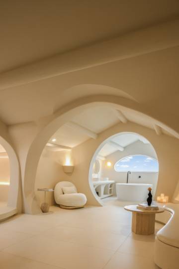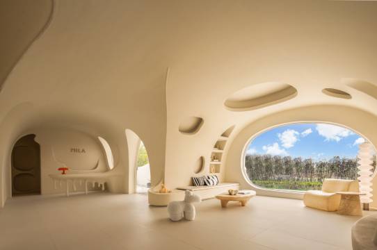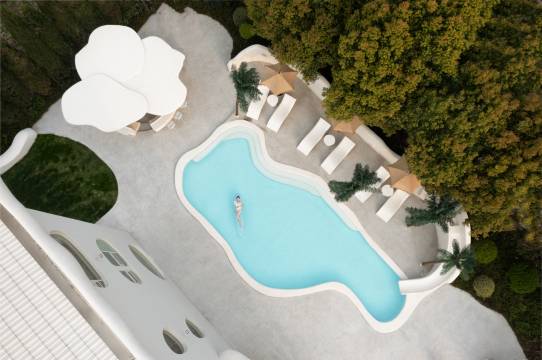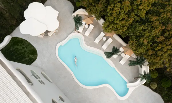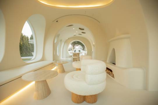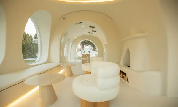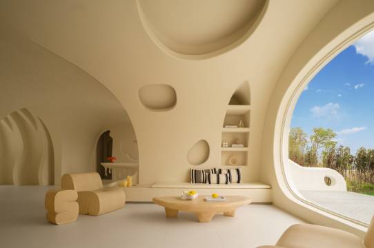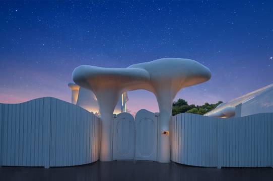 民宿选址于迪士尼度假区附近,一栋白色云朵般的城堡外观,在夕阳的映衬下,宛若成为了另一个童话城堡。客房和整体公区设计极具巧思且风格迥异,融入了有机和侘寂风,正印证了高迪的直线属于人类,曲线属于上帝。