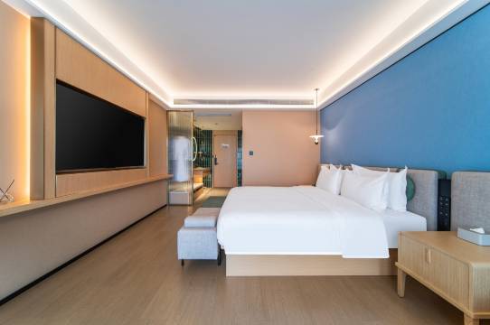 今年新开的酒店 环境很不错 设施都是全新的 停车很方便 办入住时前台小姐姐很热情 看到我带了小孩入住还提供了小朋友专属的一次性拖鞋和牙刷 非常贴心!大厅有适合各个年龄段看的书籍 房间非常大,挺干净的。洗漱台上还准备了身体乳 ,这点很好。房间里冰箱 ,有免费的矿泉水和饮料 ,晚上点了外卖还是智能机器人帮忙送到房间的,衣服都是洗好烘干给送到房间,不得不说这个酒店服务挺用心的!