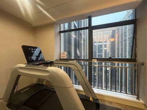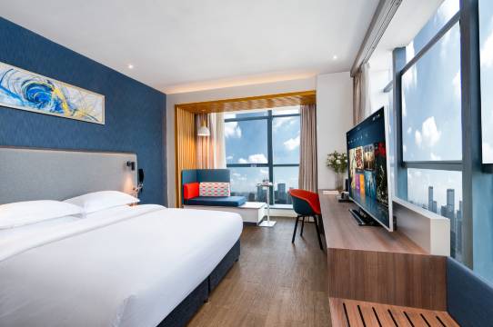 进入房间,跟想象中的基本一样,几乎完全保留了近年智选假日的装修风格。部分设施没有在使用了,比如保险箱。中央空调也停用了,加装了单体空调,靠近落地窗的一部分区域隔出来安放空调外机,所以比原始装修少了一半的风景与采光。但前台帮忙升级的这个房间依然有非常好的视野与景观。