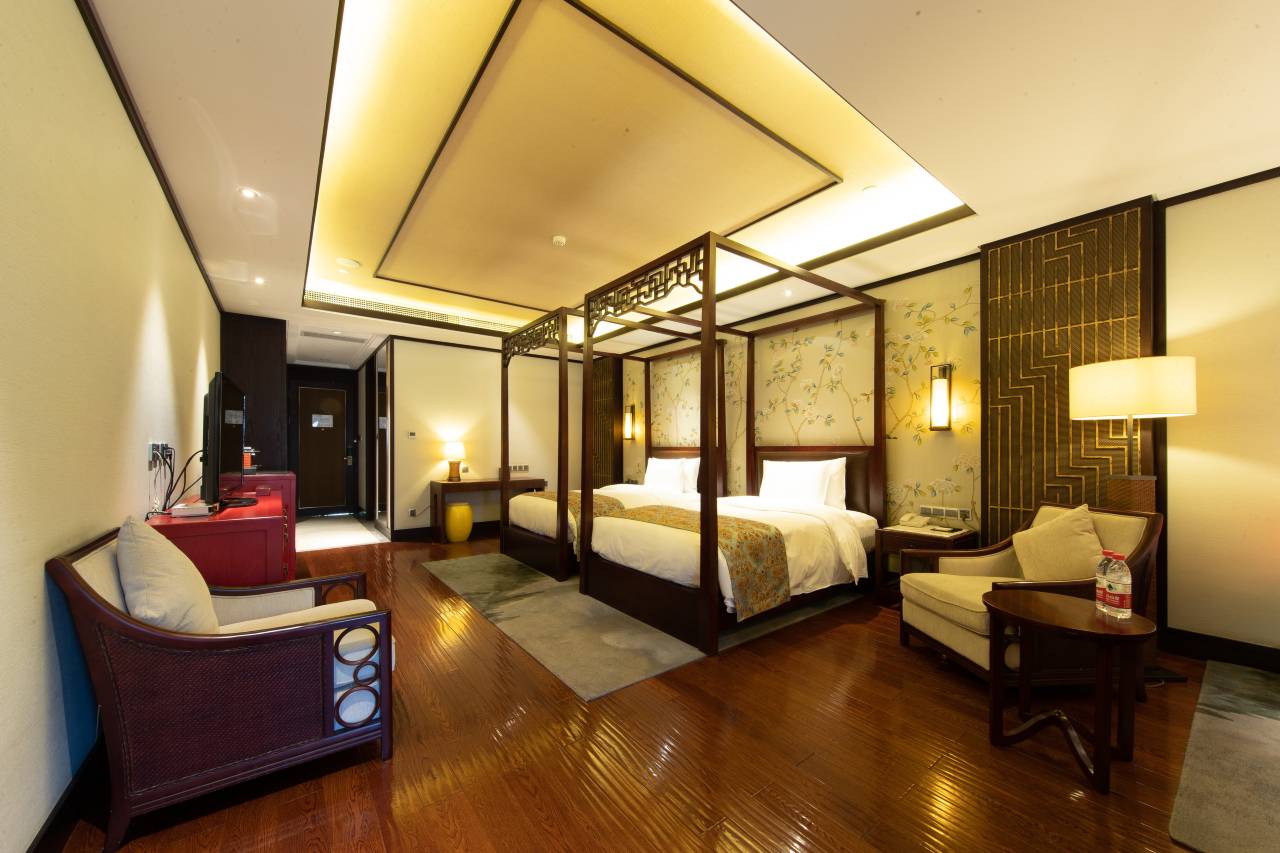 房间很大,酒店闹中取静,旁边过桥就是小吃街,都是一层二层的房间基本不会碰见别的客人,另外一边是山,孩子探险很开心。在门口就能无遮挡看无人机,非常方便。