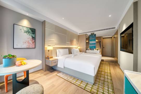 从入住到退房都很顺畅,前台小姐姐服务很好,提前电联免费升级了房型,一家出游非常方便服务态度也超级好,房间干净整洁,设施新,出行方便,性价比绝了。