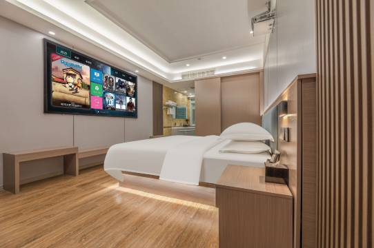 附近出差临时预订的,价格很便宜本来没报太大期望,结果一到酒店,能感受到前台小姐姐服务特别热情,还给我免费升级了房间,走廊碰到工作人员也很热情的打招呼,房间卫生也很不错,马桶智能的,还是投影房,投屏看电视很方便,空调制热也很快,酒店位置还可以,停车场位置很大,交通很方便,下次还会再来。