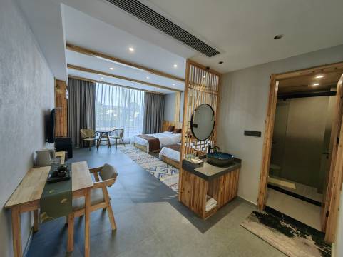 房间好大,楼上两间房,楼下大客厅,还有个茶室。酒店门口环境非常好,临酒店就还有一个景区,出酒店过马路就有各种美食店,烧烤吃着不错。还有酒店停车位非常足,喜欢。😊