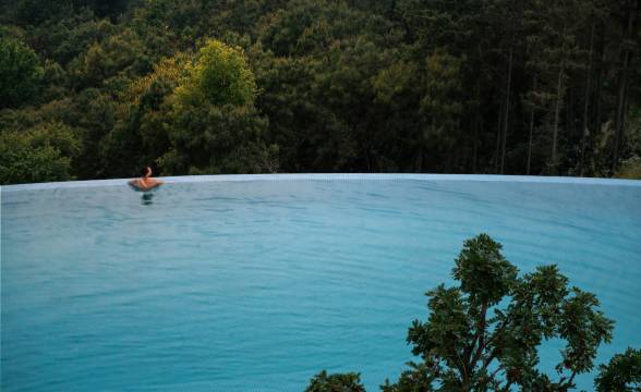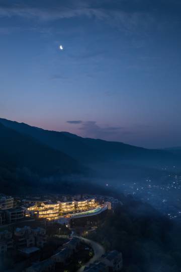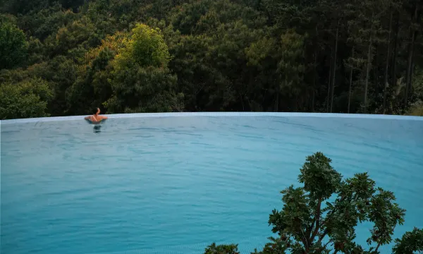 腾冲月泊半山温泉度假酒店,坐落于腾冲高黎贡山脉半山,三面环山,可俯瞰腾冲城区,建筑以“月”为核心元素,有月牙形悬壁无边泳池及景观水池,酒店房间阳台带天然碳酸温泉泡池和全景窗户。