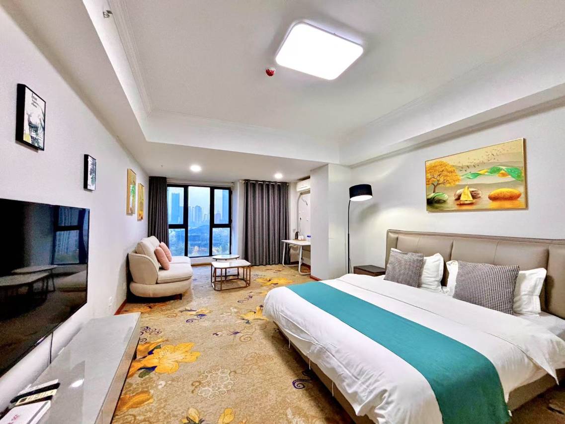 房间是公寓楼,室内家具齐全,干净整洁,就像回到了自己单身公寓的家里一样,温馨舒适之感油然而生。室内也配备了星级宾馆所需的卫浴、洗漱用品等一系列用品,使入住人既有家的感觉也享受到宾馆服务。楼层高、视野好,挺不错的一家酒店,必须给予5星好评。