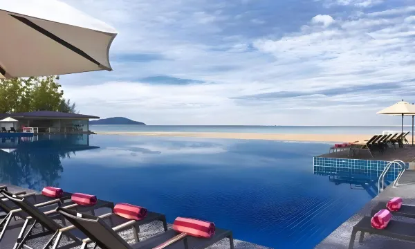离机场非常近,靠近珍南海滩景区。客房很大,房间住宿设施介于国内的汉庭和全季之间,早餐主导西餐风味,马来西亚的米饭一坨一坨抱团,陪咖喱鸡块,蔬菜只有沙拉算凉菜吧。最大的优点是靠海的游泳池,酒店内有可以观赏的海景。,
