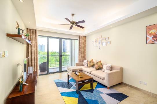 房间位于观海阁小区,离定位里的神州小镇还是有一点几公里的。这个侧海景双卫的房型都是在这个小区。优点是很安静,小区的环境也很好,不管是客厅还是阳台都能看到湛蓝大海。缺点就是不在那个神州小镇上,买东西吃东西要走出来,不过租电动车还电动车都可以上门,所以影响就不大了。