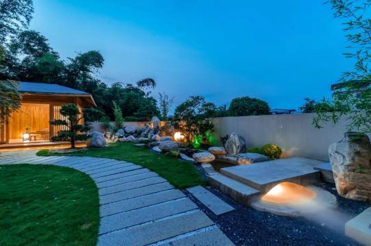 后院——门前美色重,后院雅情浓。修竹几丛,复古巷,清池塘,矮墙轩窗。珠联璧合,石灯松罗汉;黄金搭档,小桥流水弯。奇石磊峰峦,微瀑挂前川。曲径幽处通,台横小楼上。亭前高山流水调幽雅,廊下梦中婚礼曲悠扬(配古琴钢琴)。清新古典,风韵汉唐。