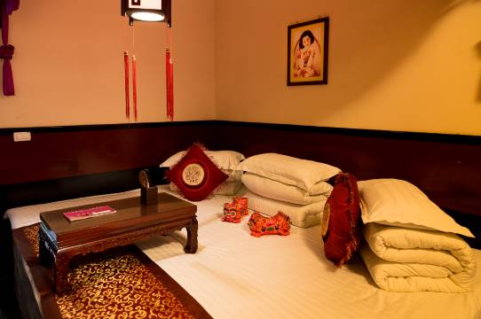 刚进入房间就能感受到古色古香的装修氛围,精致的木头架子,晾衣架也是精致的,床单上干干净净,很不错,性价比感觉很高