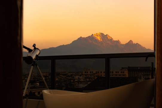 绝佳山景与日照金山:房间或观景平台拥有直面雪山的开阔视野,我在房间外边小平台可欣赏到震撼的“日照金山”景象