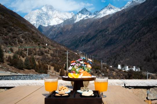 入住还会给雪山观景下午茶,而且酒店还有藏服换装体验!晚餐可以付费吃牦牛肉火锅!免费的早餐也很好吃!总之这个民宿定的很值!下次来四姑娘山还会订这家!(发的照片全是在酒店拍出来的,天气好真的可以看见四姑娘山全貌)