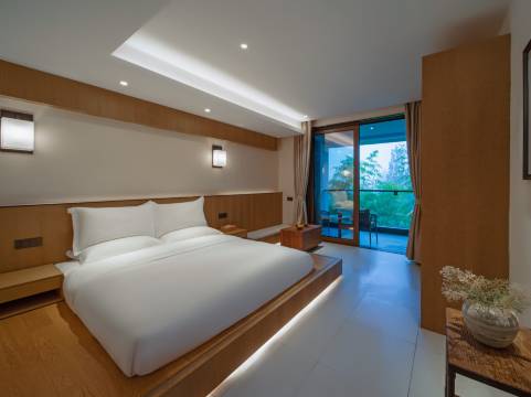 民宿整体都是质朴的风格,住宿区各种植被丰茂,绿意森森,配合自然的造景,安静又巧妙。房间内部巨大的玻璃推拉门,门外即是风景,光是看着就很愉悦,