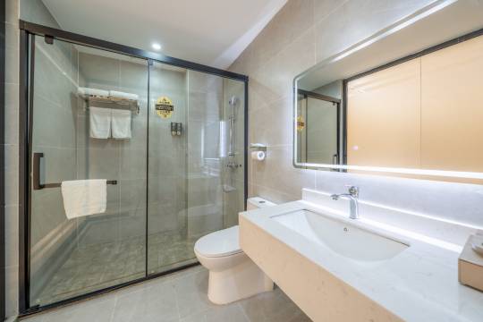 酒店后院有停车场,方便停车。房间很大,卫生条件不错,干净整洁,卫浴干湿分离,出水量很大,洗澡很舒服,早餐口味不错,很好吃