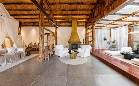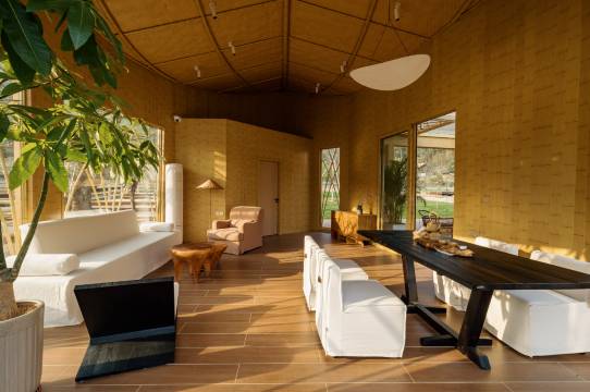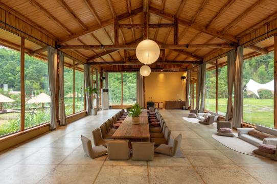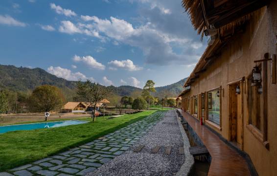 浏阳五号山谷民宿位于浏阳市沿溪镇仁和洞村,占地面积两千余亩,小溪、稻田、山峦、森林,有稻田游泳池和悬崖恒温游泳池,中西餐厅,溪边Spa屋,土地平旷,屋舍俨然,有良田美池桑竹之属的感觉。建在山谷的泥巴墙、茅草房、无边际泳池加上地暖、驼羊和梅花鹿、刚收完稻子的田野,都在述说美丽田园的静谧安宁和闲适。旷野背后,则衬以巍峨的连云山脉,山脉巨大的体量和旷野极宽的视野两相结合,巍峨和精致融汇,高耸与平野相对,更符合“久在樊笼里,复得返自然”那种世外桃源之感;