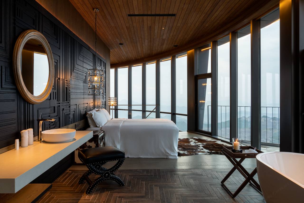非常满意的一次入住体验,不光酒店的地理位置非常特别,景色无敌,硬件设施齐全,而且酒店的服务人员非常热情周到,办理好入住手续之后一一介绍酒店各楼层的设施,并带我们去到特别的洞穴房间参观,并为母亲特意准备了长寿面和生日蛋糕,晚餐也非常丰富,很有特色,在此非常感谢酒店员工的热情服务。酒店所处的度假区步道风光让人流连忘返,酒店员工多次开着观光车到玻璃栈道接送,真的让人感觉非常贴心。真的是物有所值的秘境酒店,软件硬件非常过硬。