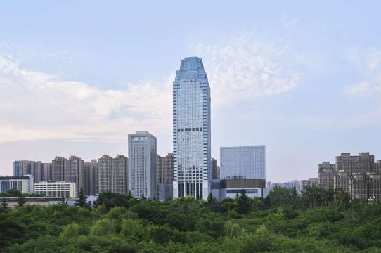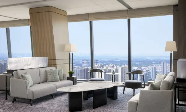 酒店现代感的设计体现着世界闻名之城的磅礴大气与本地文化的沉淀与精华。当您置身于 38 层的空中大堂或 客房的任意一间,便可在城市景观的辽阔视野中感受长安城独有的非凡气势。
