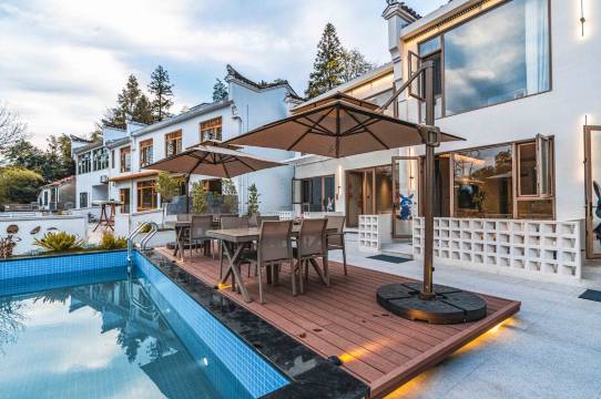 我们有两个院子和一个小酒吧,夏夜之时三五好友,点一盏烛火,或是在泳池边戏水玩闹时小酌一口,或是在烤炉前一边烤肉一边畅饮。如果你是一个人还可以坐在我们酒吧台的高脚椅上跟我们管家喝一杯。可以嘻嘻喧闹也可以独享这星辰皓月。这是我们想为您呈现的。