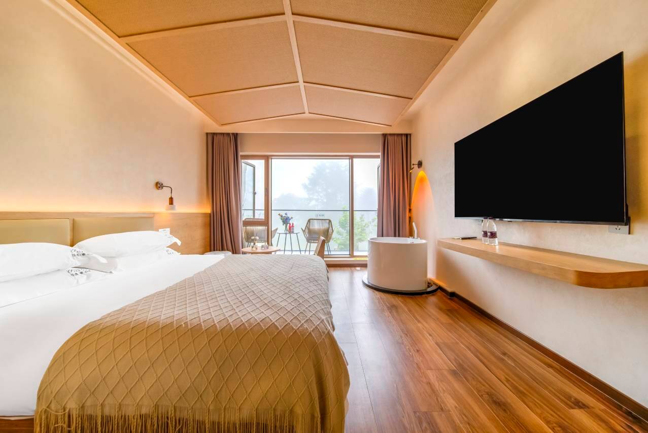 中央空调 全屋地暖 智慧客房 智能马桶 山泉热水这些都是基础配置。最为难得的是我们房间的落地窗每一扇都是面对着对面的山,四季轮换景色不同,客房配备的金可儿床垫和定制的床品,加上这坐拥一片森林的负氧离子。一个好的睡眠真的会让人很幸福。