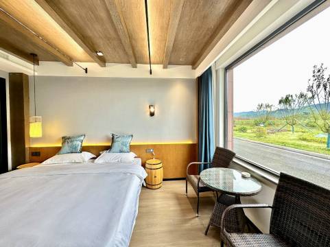 房间宽敞,设施齐全,卫生很好。非常喜欢房间的配色,素雅有品位。房间门口可以看见对面的山峰,雨后山峰云雾缭绕,宛如仙境。房间屋顶有两个观星窗,躺在床上即可看星星,遗憾因为下雨没看成。早晨会被鸟鸣声叫醒,空气清新,沁人心脾。早餐简单,味道可口。免费品尝了丹凤葡萄酒,太好喝了,果断买了一箱带回。
