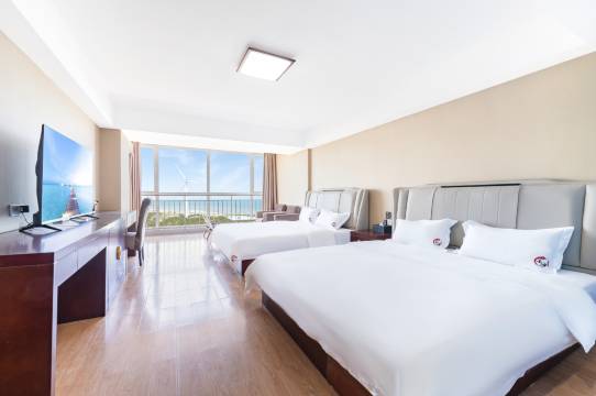 这个酒店就在那香海海边上,从落地窗能看出去视野里全是大海,真的很棒。房间干净宽敞,床品舒适卫生,楼下有好几家海鲜烧烤摊,还能租到电动车和汽车,挺方便。去港西镇就几公里,镇上吃饭和购物,挺热闹的。