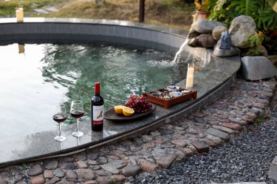 首先很喜欢民宿的位置,在一个水库旁边,环境清幽,民宿院落很大,傍山而建,玩乐设施完善,非常适合带小朋友来玩或公司团建,有温泉,餐厅,茶室,球场,泳池,K哥(而且管家小哥哥唱的不比驻唱歌手差,点赞👍🏻)。店家给升级了带院子的房间,我家两只毛孩子可以住院子外头,非常合适。夜晚还有一只跟布偶一样漂亮的小猫咪作伴,可可爱爱。民宿客用品不错,梳子和一次性刮胡刀很精致简直可以当纪念品。晚上在星空下听着虫鸣,吹着温暖的春风,喝着小酒,非常放松。白天,对着空幽的水库和苍翠的延绵的群山,泡温泉和品茶,再惬意不过。假期的快乐,大抵如此。