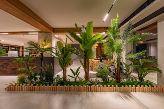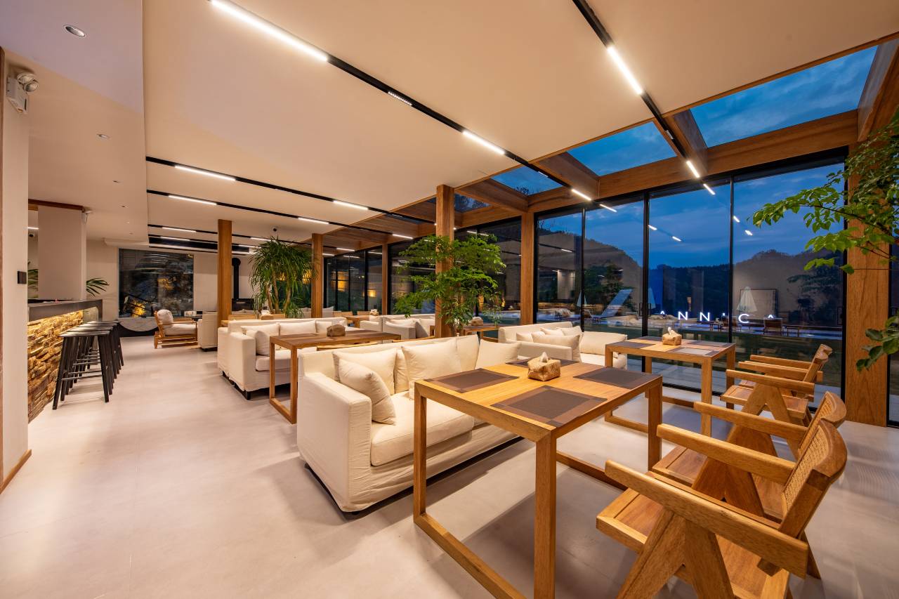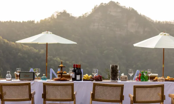 酒店总占地面积 3500m²,建筑面积 1800m²。酒店位于张家界武陵源梓木岗,距离张家界森林公园梓木岗门票站直线距离仅为 80 米,为旅客出行游玩提供了极大的便利。民宿公区配备:餐厅,酒吧 ,健身房,茶室 ,会议室,另有露天景观泳池200m²,户外草坪 1500m²,及泳池周边空地 400m²,可举行大型活动,如婚礼,团建等。酒店正面临塘,背靠峡谷,封闭式私家庭院结构,身处深林之中,以“极简侘寂风”为设计理念,建筑前后均采用落地大玻璃,房间任何角落都能开窗见景,真正的让客人体会到身处大自然,融入大自然。