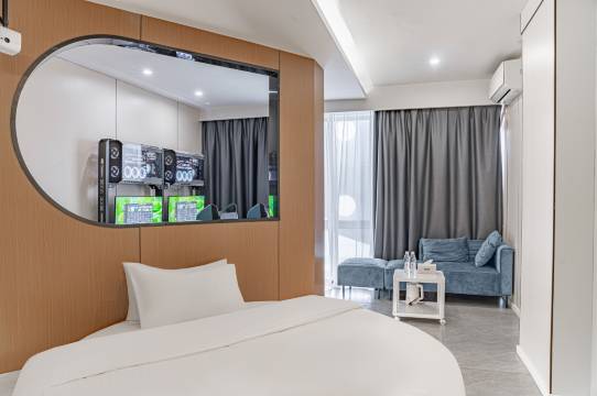 酒店房间设计独特,环境整洁,服务贴心。洗衣设施便利,电竞设备流畅,游戏畅快。楼下餐饮便捷,接送机服务周到。设施完备,一次性洗漱用品干净卫生,洗衣机烘干机齐全,是理想之选。