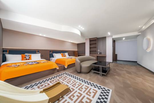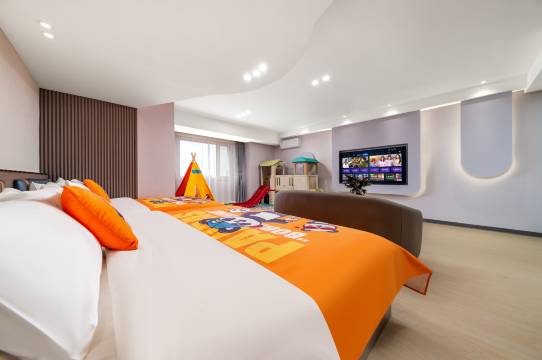 房间面积超大,两张床一张2米,一张1.8米,特别舒服,还有投影尺寸也超大,早上和孩子还一起看了一部电影。位置也很好找,就在万达广场里,购物也很方便。整体推荐。