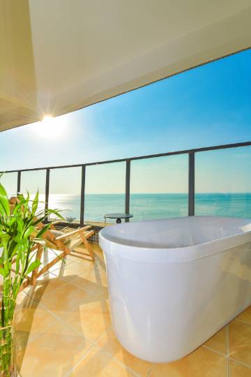 房间宽大卫生干净大床房柔软;卫生方面做得很好,服务也是非常到位,阳台就能看见海,非常不错下次来继续住