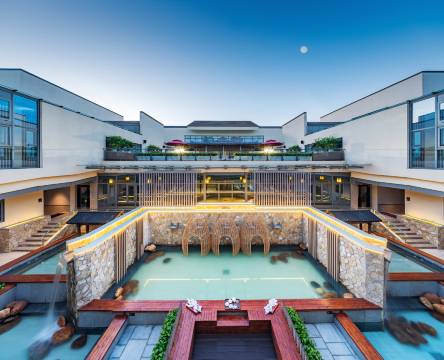 度假村面积约6.17万平方米,由三栋各具特色的酒店(宕口酒店,天池酒店,温泉酒店)组成,徐州园博园涵田度假村将当代生活与大自然完美融合,形成观景、攀山、渡桥、休憩、归园、观水的多样空间体验。