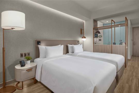 第一,酒店位置蛮好的,步行就能到商场。酒店大楼 分2部分,一部分是hotel,一部分是residential,check-in的时候 前台免费给我们升级到1卧套房,刚开始还蛮开心的,后来才知道我们要坐residential的电梯,要找我们同伴,要先下楼到3楼的前台那边,乘另外一部电梯,然后隔音有点糟糕,入住当晚 隔壁停车场有活动,音乐吵了一晚 很大声 到凌晨 (我们住八楼哦,还很大声)隔壁房间水龙头的声音都能听到,其他都还不错,因为酒店蛮新的,工作人员都蛮热情的,酒店的早餐体验感太差,选择性太低,不值1500p,住residential这边 房间不提供矿泉水,因为有过滤器,前台说 可以直接喝